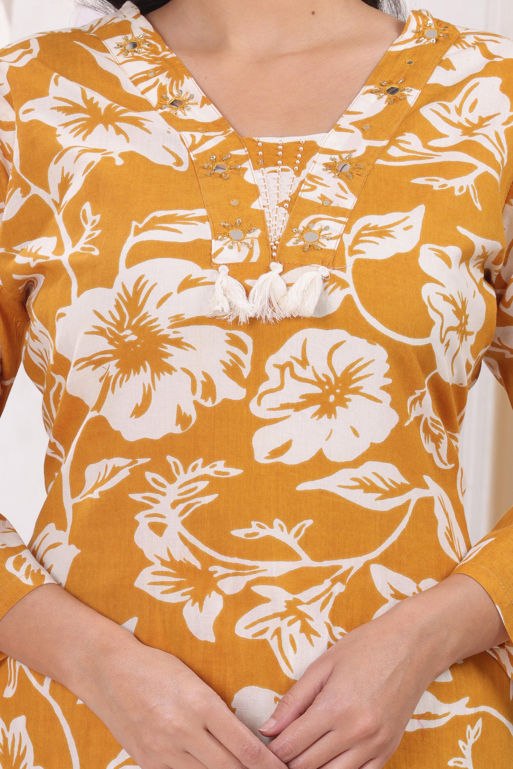 Gulabi Leaf Printed Pure Cotton Embroidered Kurta, Pant With Dupatta