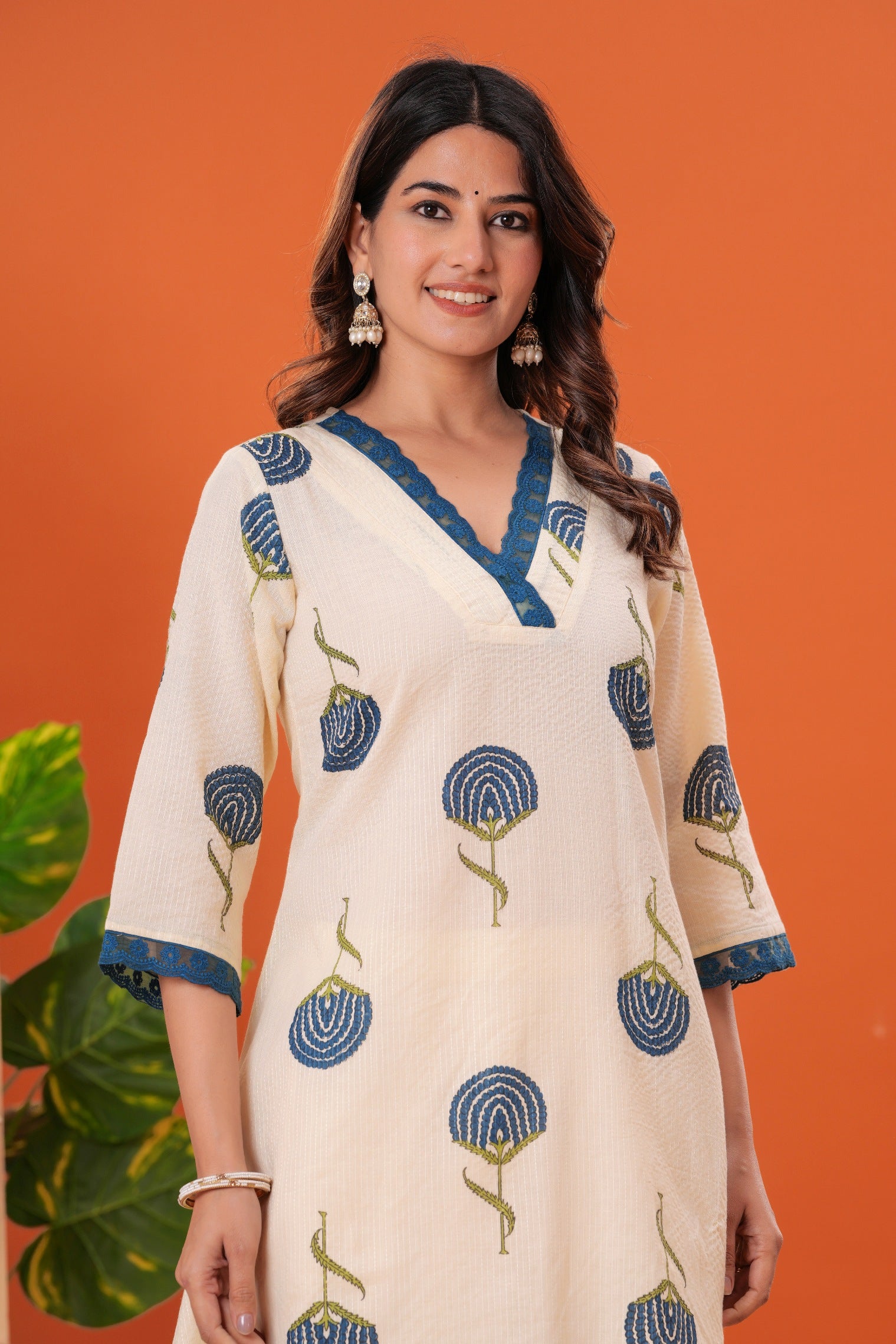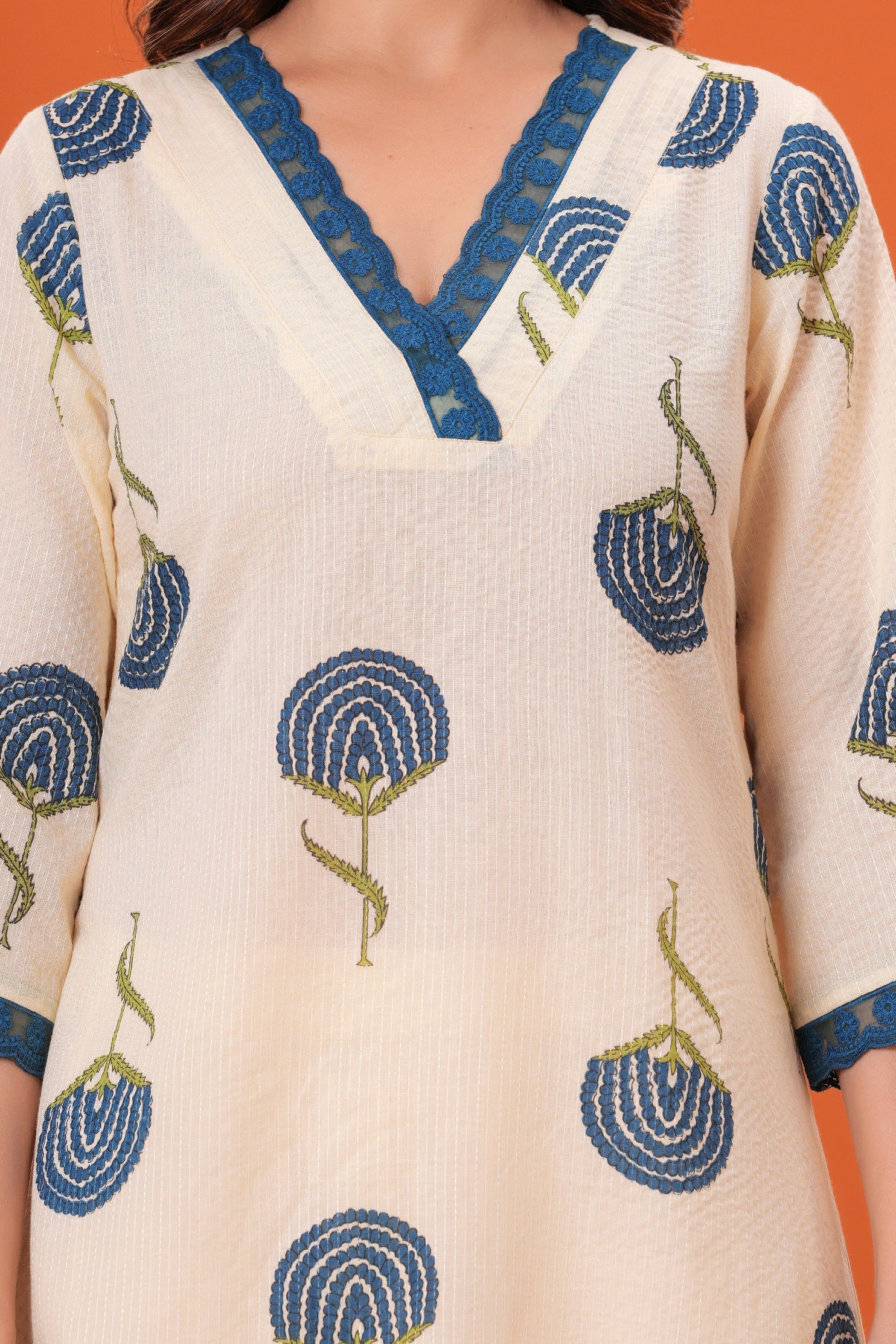 Cream-colored printed top, has a v neck and three quarter sleeves, secured with slip on closure